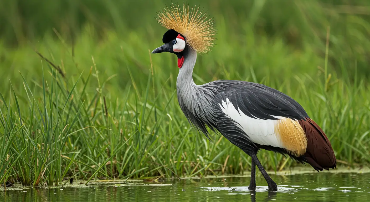 The Crowned Crane is a beautiful and tall bird known for its catchy golden feathers. They form a crown-like shape on its head. This bird is also found in zoos and wildlife parks. Crowned Cranes are known for their graceful dances during mating season.