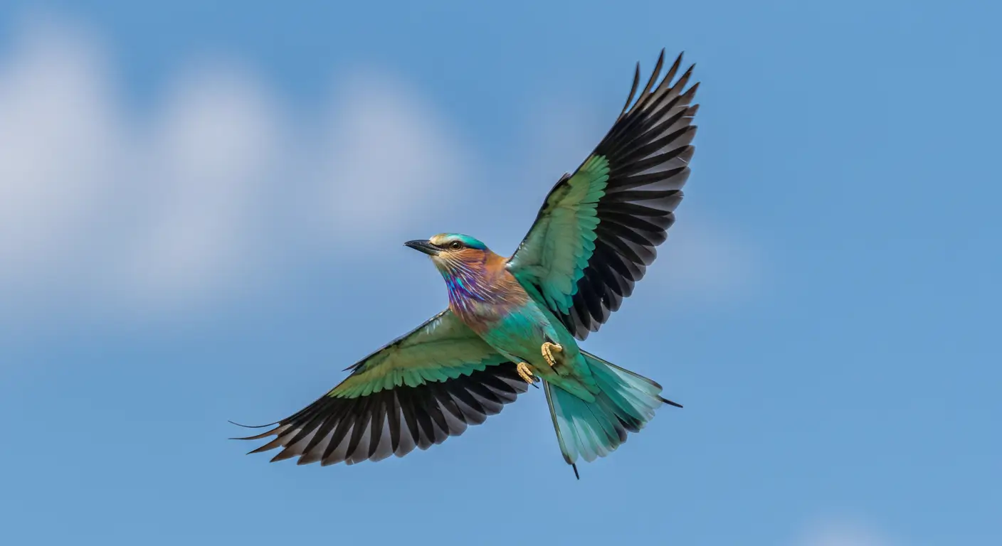 Males perform impressive dives and rolls during courtship. It’s part of the roller family and hence named for these rolling flight displays. It’s a favorite bird among birdwatchers worldwide for its bold colors and unique behavior.