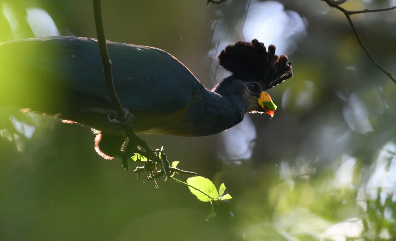 The Great Blue Turaco plays a vital role in keeping forests alive by eating fruits and later dropping seeds far from the parent tree. This act helps new plants grow in different areas.