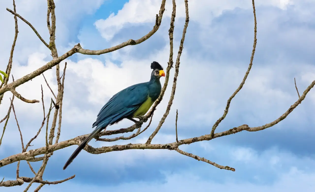 The Great Blue Turaco is admired for its vibrant blue and green feathers. It is one of the most colorful birds in Africa. Its chest is yellow, and its tail has a unique red tip that gives it a striking look when it flies.