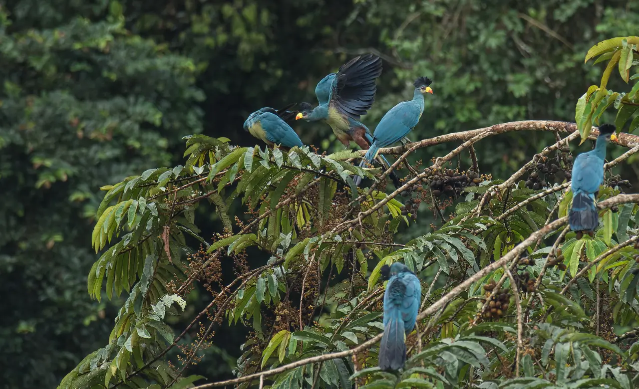 Great Blue Turacos are rarely seen alone. They live in small family groups of up to 20 birds. These groups move together through the forest and call loudly to stay connected.