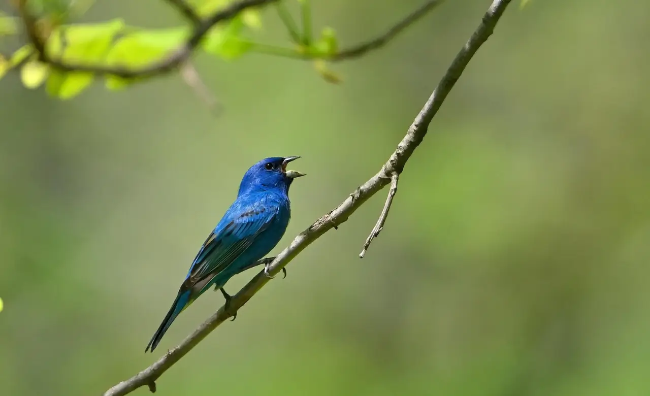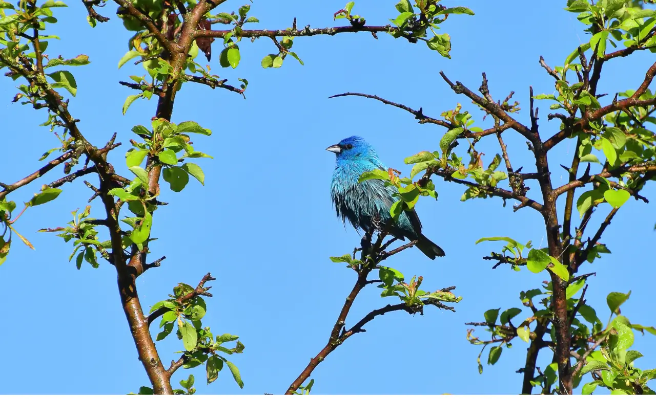 Male Indigo Buntings are known for their sweet and high-pitched songs that carry across fields and forests. They often sing from the very top of trees or powerlines to let rivals know that the area is taken. Their songs are a strong defense against other males. These musical calls can be heard all summer long.