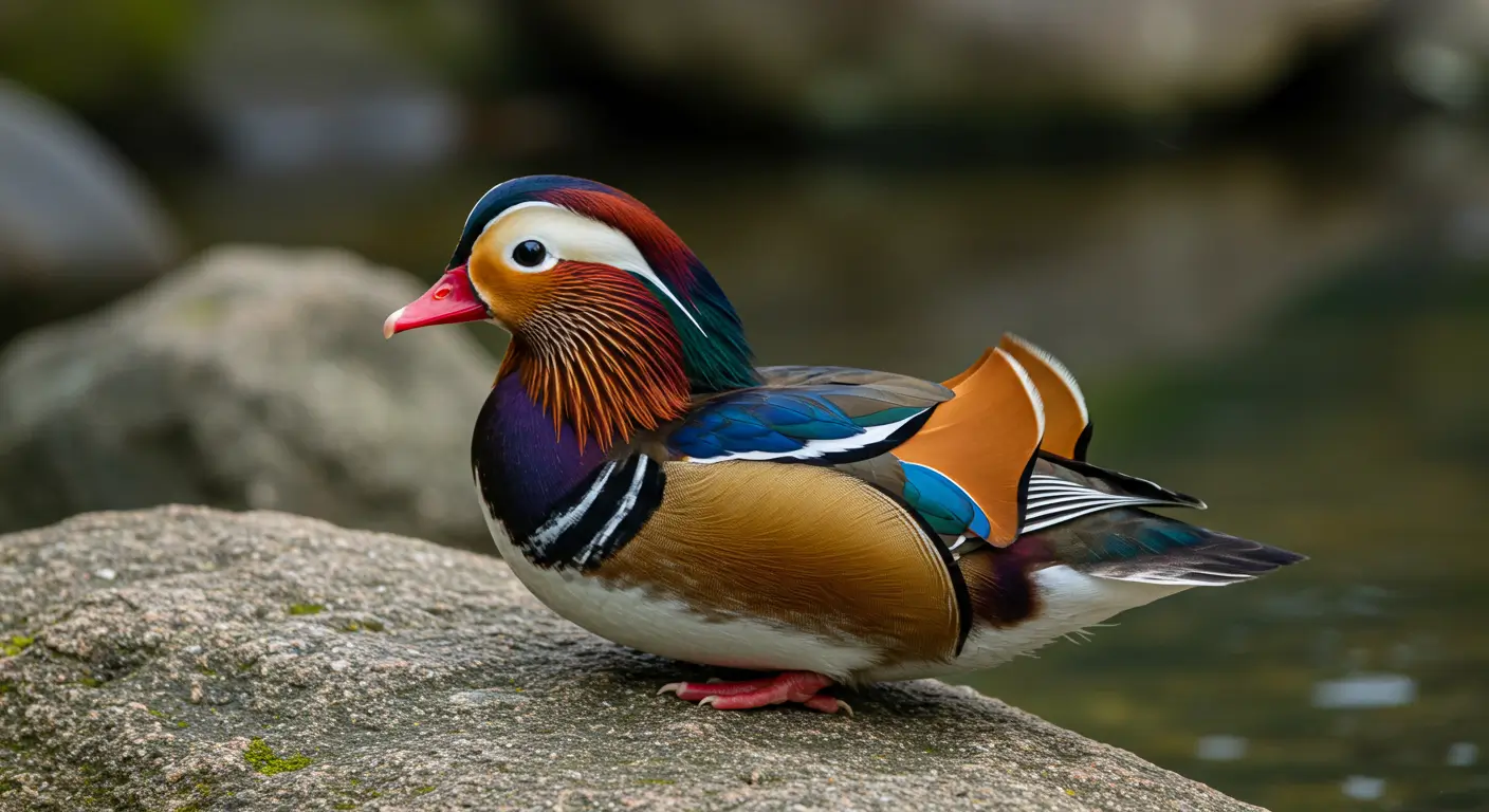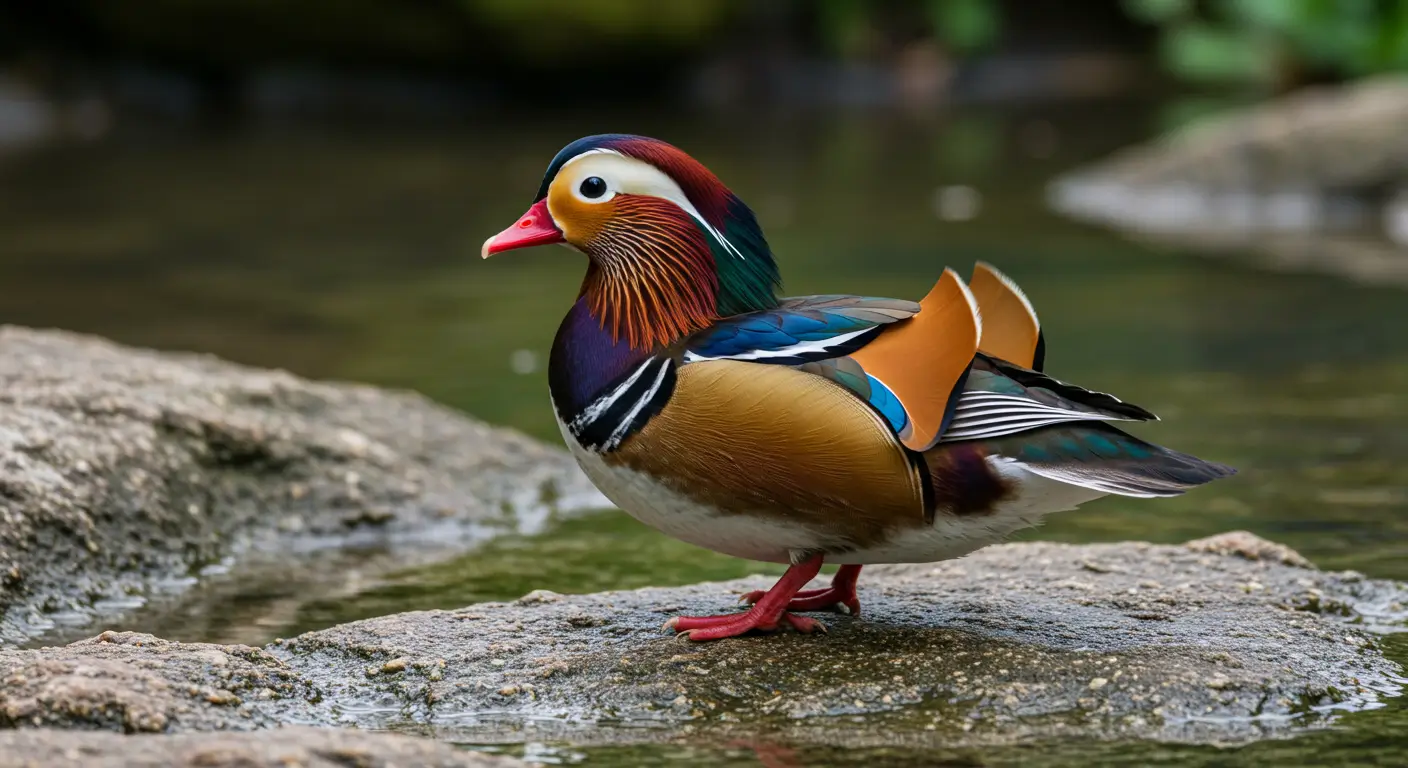 The Mandarin Duck is a colorful waterfowl seen especially in parks and zoos. They live near lakes, ponds, and slow-moving rivers, feeding on seeds, insects, and plants. They nest in trees unlike most ducks and use hollow trunks for shelter. Some have escaped captivity and formed small wild populations although they are not native.