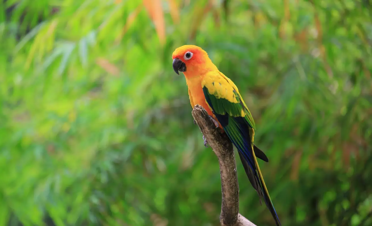 The Sun Conure is also called the Sun Parakeet. It is a brightly colored parrot known for its orange, yellow, and green feathers. It is a popular pet bird because of its playful and affectionate nature.