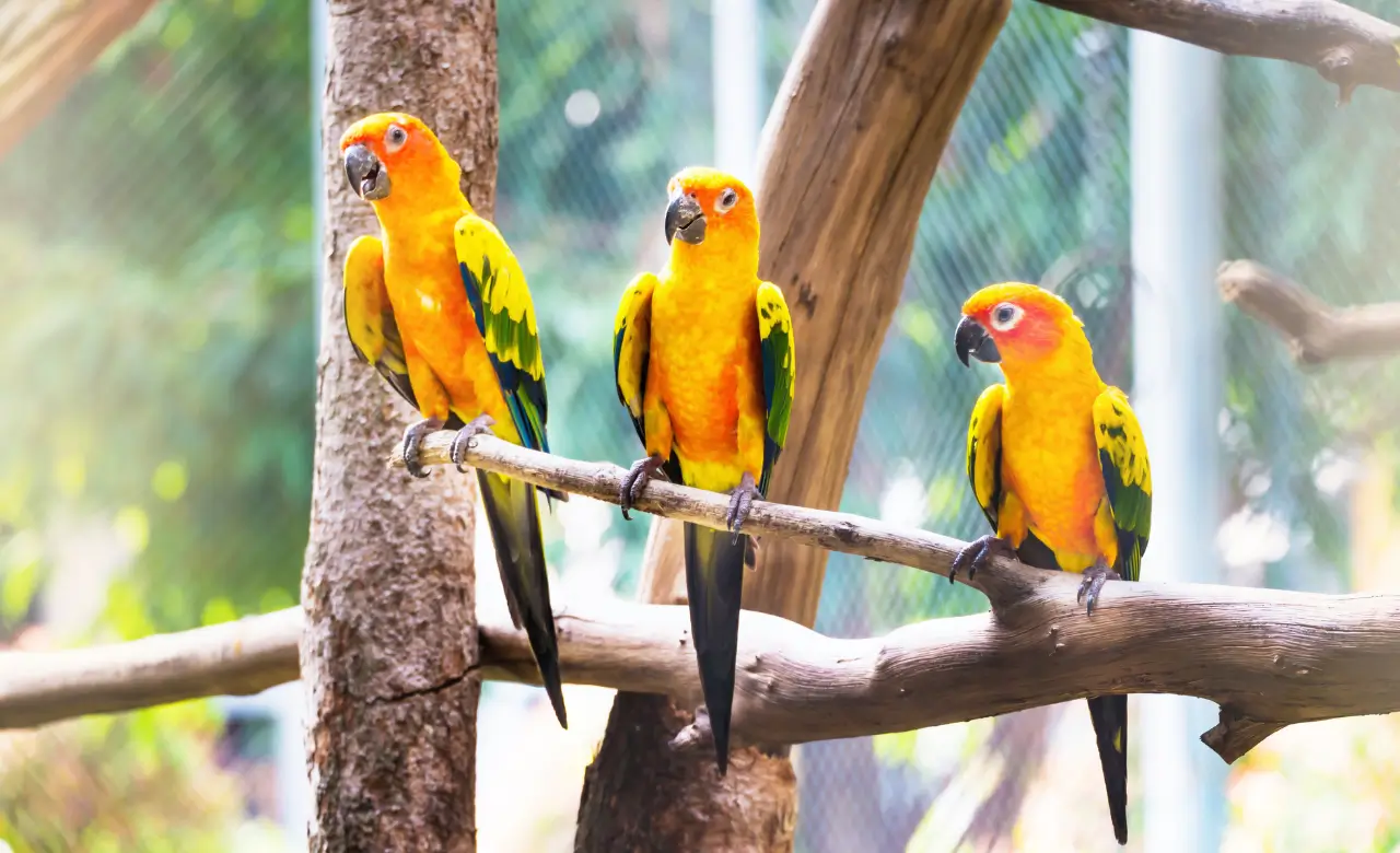 Sun Conures catch attention by their bright colours and playful behaviour.