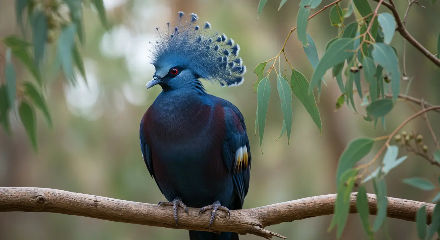 The Victoria crowned pigeon is a large and blue-gray bird native to the rainforests of New Guinea. It stands out with its beautiful lacy crest, deep red eyes, and soft cooing sounds. This pigeon is the largest in the world, reaching up to 30 inches in length.